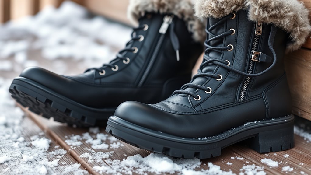 To choose stylish winter boots, focus on finding a balance between fashion and function. Look for materials like waterproof leather or high-quality synthetics, and guarantee they have insulation for warmth. Select boots with slip-resistant soles for icy days and a comfortable fit for all-day wear. Trendy styles like ankle boots or chunky soles can elevate your look, but don’t forget practicality. Continue exploring to discover how to perfect your winter footwear choice.