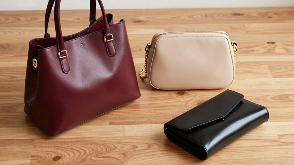 - For professional settings, opt for structured shapes like top-handle or satchels, focusing on handbag color coordination with your wardrobe to create a polished appearance.