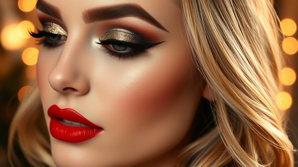 To make your eye makeup stand out without overdoing it, focus on bold eyeliner that enhances your eye shape. Pair it with eyelash extensions to add volume and drama effortlessly. Keep the rest of your makeup subtle—neutral lips and soft blush—so your eyes remain the focal point. This balance creates a striking, glamorous look perfect for holiday parties without feeling overdone.