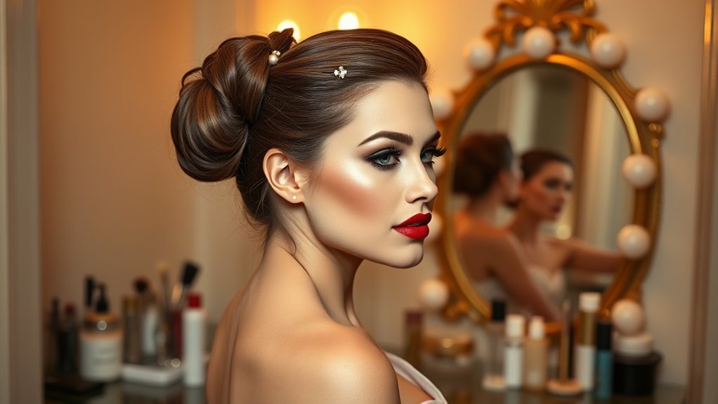 To get party-ready in just 30 minutes, focus on quick, polished hairstyles that shine. Create soft waves with a curling wand, then add festive accessories like sparkly clips or headbands. Try a sleek ponytail with a twist or a chic messy bun for effortless style. Incorporate simple half-up, half-down styles with holiday pins to elevate your look. Keep it simple yet stunning—there’s more tips inside to make your holiday hair truly festive.