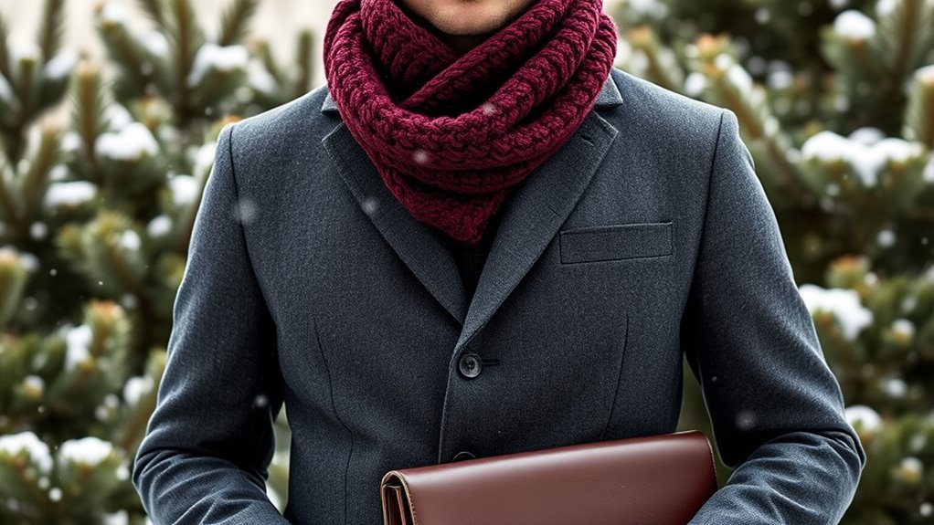 You can maintain a professional appearance in winter gear by choosing business casual options that look polished yet keep you warm. Opt for tailored jackets, neat sweaters, and clean, well-maintained boots that align with your dress code. Layer smartly with dress shirts or blouses under insulated blazers. Keep accessories minimal and tidy, ensuring your winter attire complements your professional image without sacrificing comfort or adherence to your workplace’s dress code.