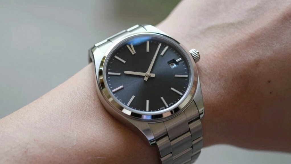 Have you ever worn a watch that just didn’t sit right on your wrist? Choosing the right diameter is key to avoiding this. To stay on-trend, consider current fashion trends that favor larger or more subtle watches. The watch material also influences how it looks and feels; metal cases often appear more substantial, while leather or ceramic can be lighter and more versatile. Keep these tips in mind: