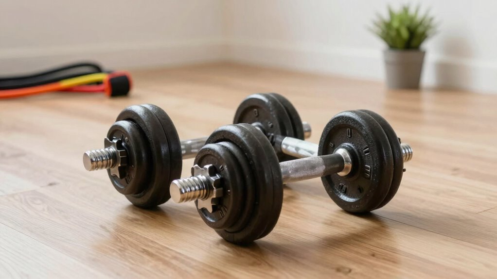 With adjustable dumbbells, you transform your home gym into a sleek, organized oasis where every rep feels effortless. They’re like your personal gym elves, neatly tucking away weights and clearing space for more gains and less clutter. Embrace these space-saving marvels, and watch frustration melt away like ice in the sun. Now, your workout routine can shine brighter than ever, making fitness a joy rather than a chore—your perfect partner in this fitness adventure.