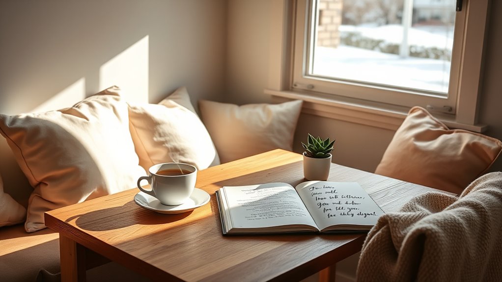 Getting quality sleep is essential for preventing burnout. Good sleep hygiene, like sticking to a consistent schedule and avoiding screens before bed, helps you rest better. Rest strategies such as relaxing routines or meditation can improve your sleep quality, keeping your energy levels high. When you prioritize sleep, you boost your resilience against stress and exhaustion, making it easier to handle daily challenges and stay motivated as the new year approaches.