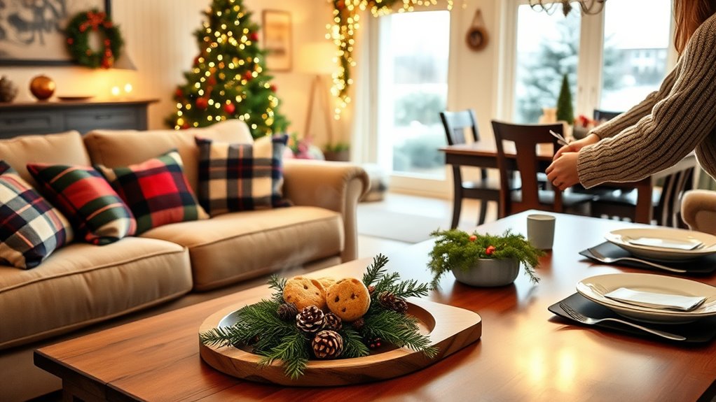 You can manage allergies or dietary needs by asking your guests about their specific allergy-friendly meals and dietary accommodations beforehand. Stock allergy-safe snacks, clearly label foods, and prepare separate dishes if needed. Use fresh ingredients to avoid cross-contamination, and communicate openly with your guests to guarantee their needs are met comfortably. This proactive approach makes everyone feel welcome and cared for during the holidays.