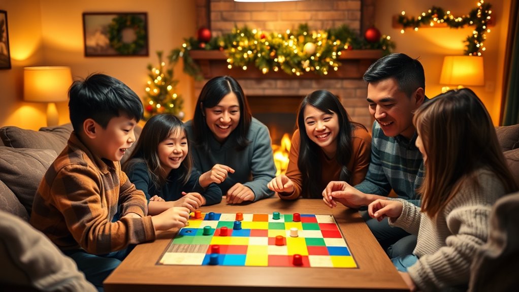 You should choose age-appropriate games that emphasize interactive challenges and cooperative play, making sure everyone can participate and have fun. Look for games like “Candy Land” or “Uno” for younger kids, and more strategic options like “Catan Junior” or “Ticket to Ride” for older players. These games foster teamwork, reduce conflicts, and keep everyone engaged, creating memorable family moments after holiday dinners.