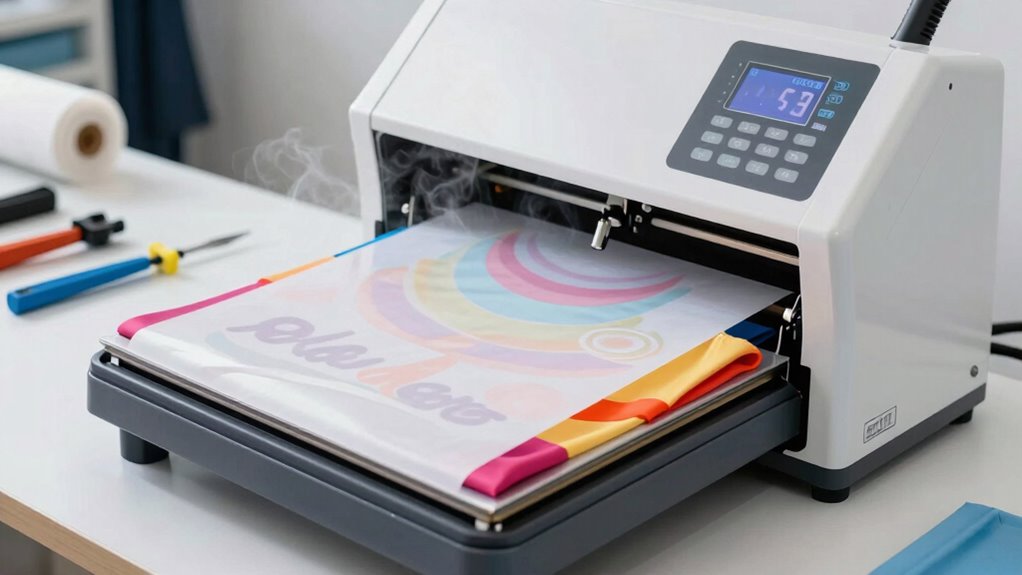 Before pressing, you need to guarantee your design and material are properly prepared to achieve the best results. Start by using design software to create or refine your design, ensuring clarity and proper resolution. Apply color theory principles to select colors that complement each other and stand out on your material. Check that your design fits the size and shape of your substrate for a seamless transfer. Use a heat-resistant cover sheet to protect your design during pressing. Additionally, pre-press your material briefly to remove moisture and wrinkles, ensuring a smooth surface. This preparation minimizes errors and guarantees vibrant, durable results. Properly preparing your design and material is essential for achieving professional-looking, long-lasting heat transfers. Familiarity with solar safety standards can also help you develop precision and control during your project.