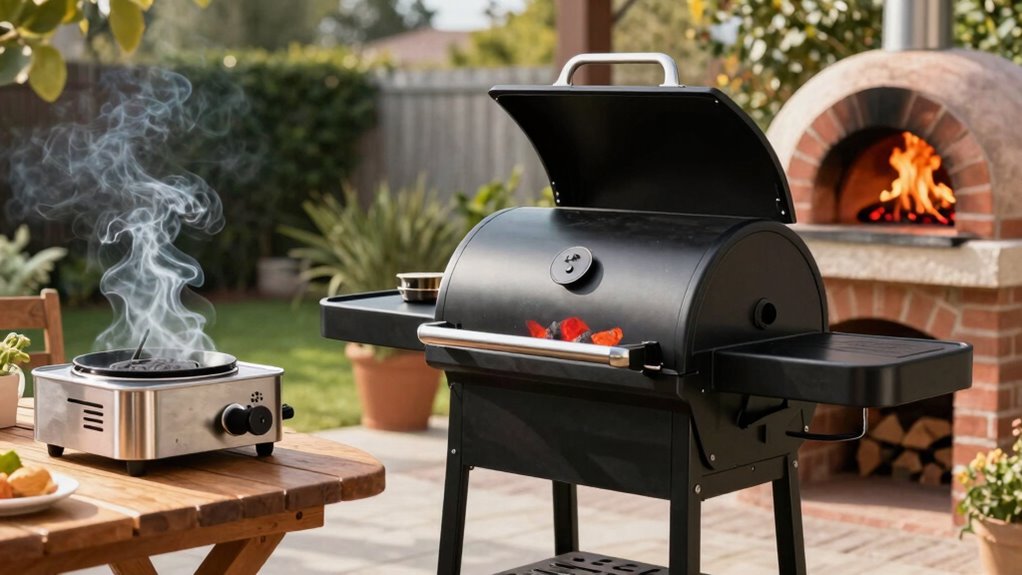 Is the richness of smoke flavor the deciding factor when choosing a grill for smoked meals? If so, pellet grills often stand out because they produce a deep, consistent smoky taste. Their ability to maintain steady temperature and smoke levels makes them ideal for enhancing flavor, especially when paired with the right grill accessories like smoke boxes or flavor chips. This richness can elevate your outdoor decor, transforming your space into a true barbecue haven. While portable grills or pizza ovens may lack the same smoke depth, they excel in versatility and convenience. Still, if your main goal is that authentic, robust smoky flavor, pellet grills are your best bet. They deliver the depth you crave, making every smoked bite unforgettable. Additionally, some pellet grills incorporate advanced features such as electric power generation, which can further improve their efficiency and functionality. Incorporating landscaping elements around your grilling area can also create a more inviting atmosphere for outdoor cooking and gatherings.