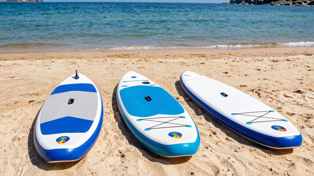 Wider and thicker paddle boards not only improve stability but also influence how smoothly you can glide across the water. Increased width and thickness can enhance hydrodynamic efficiency by providing more surface area, which helps with balance but may slightly reduce speed. Thinner and narrower boards typically cut through water more easily, offering better glide and faster movement. Material impact also plays a role—lighter, streamlined materials reduce drag, boosting speed and efficiency. However, keep in mind that extra width and thickness can add weight, potentially slowing you down if the board becomes too heavy. Finding the right balance between stability and hydrodynamic performance is key to maximizing your speed and glide without sacrificing control.