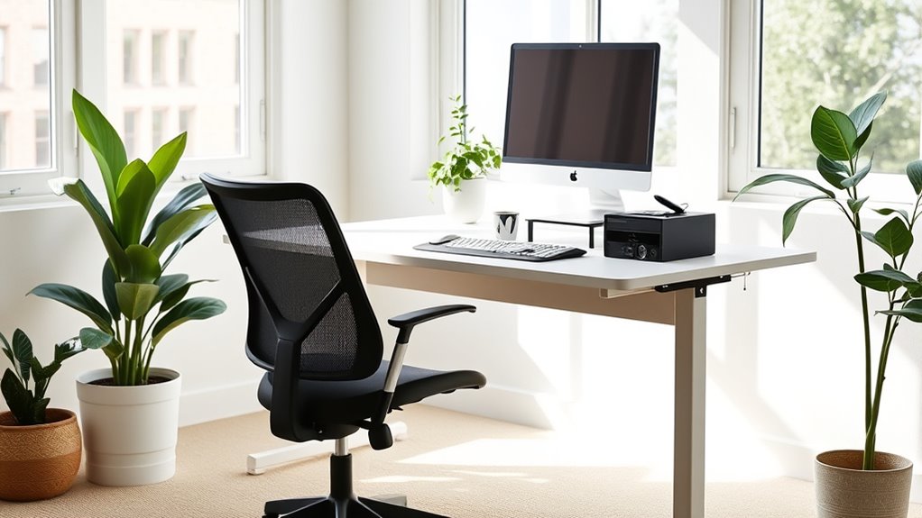 Next, pay attention to ergonomic accessories that make your home office more supportive. Investing in a good ergonomic chair is vital, but you can also enhance comfort with accessories like lumbar supports, footrests, and adjustable monitor stands. Lumbar cushions help maintain the natural curve of your lower back, preventing soreness after hours of sitting. A footrest ensures your feet are flat on the ground, promoting better circulation and reducing pressure on your legs. An adjustable monitor stand helps position your screen at eye level, preventing neck strain and encouraging proper posture. These accessories are small but impactful, making it easier to sit correctly and work efficiently. Additionally, understanding the role of contrast ratio in projectors can help you optimize your home theater setup for better visual comfort during movie nights.