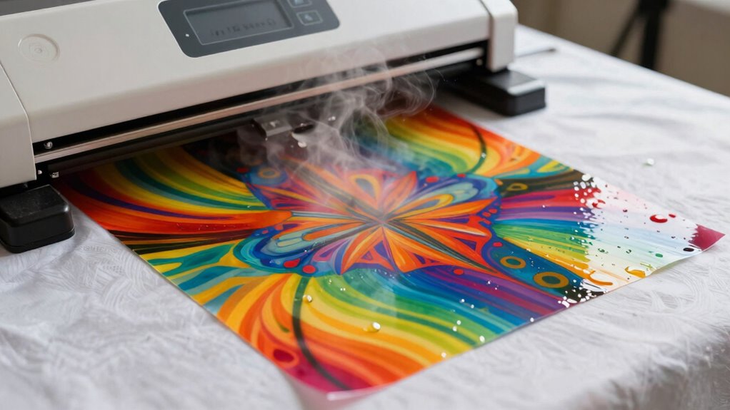Once your design files are ready, it’s time to move on to executing the printing process. First, guarantee you follow sublimation safety by working in a well-ventilated area and wearing protective gear if needed. Set your printer to the correct sublimation settings, including temperature, pressure, and print quality. Handle your sublimation ink and transfers carefully, respecting printing etiquette to avoid smudges or misprints. Before printing, double-check your design orientation and mirror the image if necessary. Always use compatible sublimation paper and avoid touching the printable surface to prevent smudges. Proper printing etiquette ensures a cleaner process and better results. Once everything is set, start the print and monitor the process closely. Proper execution ensures vibrant, long-lasting results and a smooth project workflow.