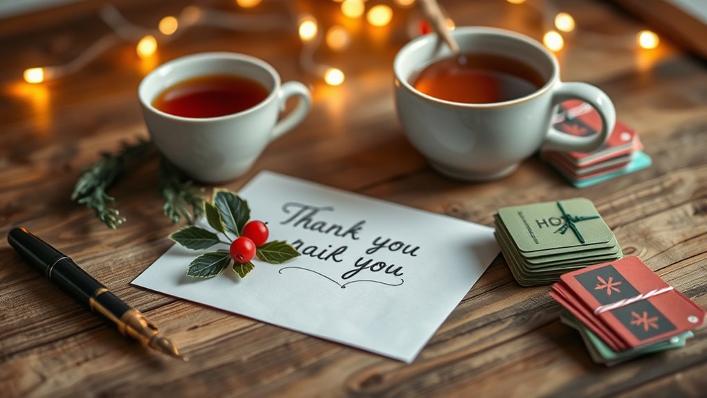 Remember, a thank-you note is like planting a seed of gratitude; with your genuine words, it grows into a lasting bond. Just as a small gesture can brighten someone’s day, your appreciation can ripple outward, spreading kindness and connection. So, after the holidays, take a moment to nurture these relationships. Your heartfelt thanks are the sunlight that helps these seeds flourish, creating a garden of warmth and goodwill that lasts well beyond the season.