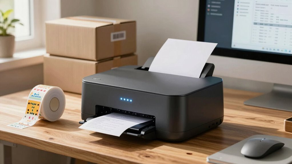 Your label printer acts as a versatile artist, ready to handle a spectrum of materials like paper, plastic, and even fabric. Material compatibility guarantees your labels stick and last, while regular printer maintenance keeps this creative powerhouse humming smoothly. With proper care, your printer transforms raw materials into professional labels, elevating your home business to new heights. Trust its adaptability to meet your evolving labeling needs effortlessly.