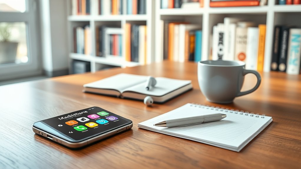 Another essential aspect of many self-improvement apps is mindfulness meditation. In today’s fast-paced world, taking a few minutes each day to practice mindfulness can markedly reduce stress and enhance focus. These apps often include guided meditations, breathing exercises, and sleep aids that are easy to follow, even if you’re new to meditation. Regular practice helps you become more aware of your thoughts and emotions, making it easier to manage anxiety and improve overall mental clarity. Plus, mindfulness meditation fosters a sense of calm that can positively influence your daily interactions and decision-making.