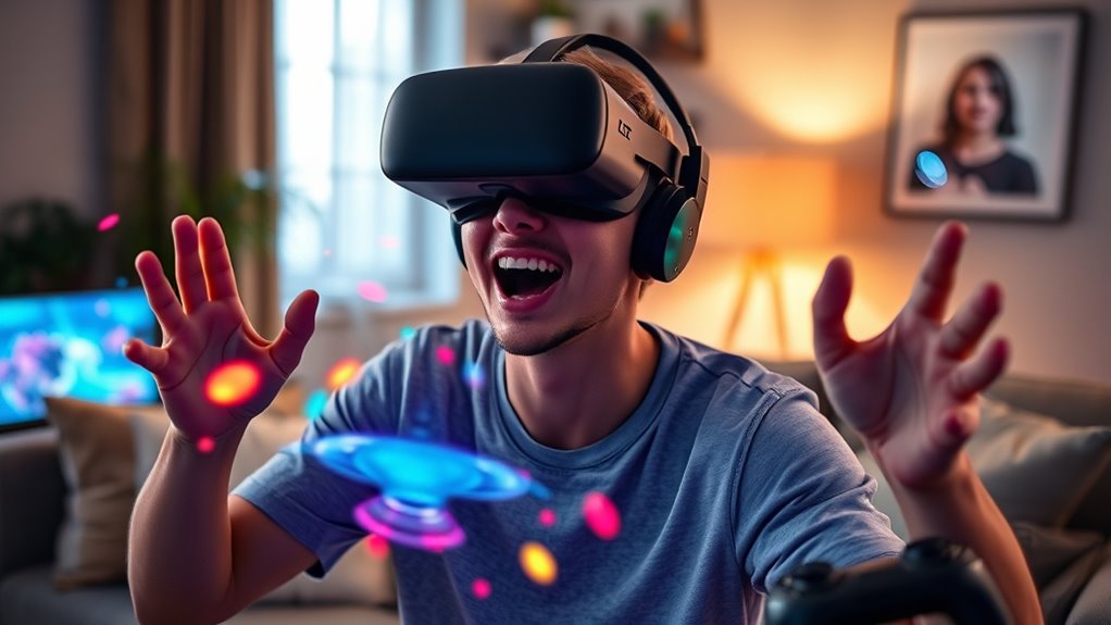 Getting started with VR gaming at home means first checking if your hardware supports the VR headset you want. Make sure your gaming console, PC, or mobile device is compatible to avoid surprises. Proper setup, including adjusting fit and settings, helps prevent motion sickness and makes gameplay more comfortable. Starting slowly with shorter sessions and taking breaks ensures you enjoy VR safely. Stay tuned to learn more tips for a seamless, immersive virtual reality experience.