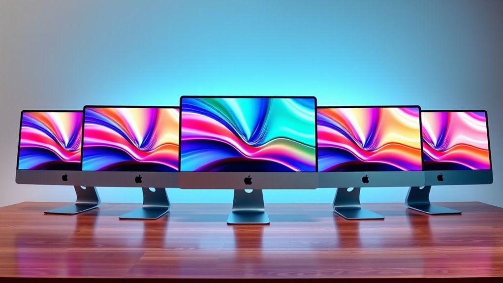 If you’re exploring the best 24-inch iMac options in 2025, I recommend considering models equipped with the powerful M4 chip, vibrant Retina displays, and stylish, colorful designs. Look for configurations with ample memory and storage to support your creative or professional tasks. Keep in mind port limitations and external device needs. If you want to find out which options suit your work or entertainment style, there’s more to uncover below.