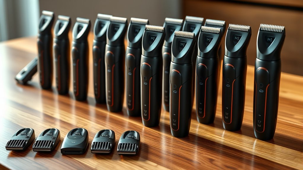Choosing the right beard trimmer often depends on the attachments and settings it offers, as these features determine how much control you have over your grooming results. Multiple attachment guards and adjustable length options let you customize from close stubble to longer beards with ease. Some models include a dial or digital display to select and lock in precise lengths, like 0.5mm to 10mm, ensuring consistency. Interchangeable guards and combs provide versatile styling for different beard and hair types. Others feature built-in adjustable wheels or sliders, reducing the need for multiple attachments and streamlining the process. The variety and availability of settings directly impact your ability to achieve tailored, consistent grooming results, making these features essential in choosing the best cordless beard trimmer.
