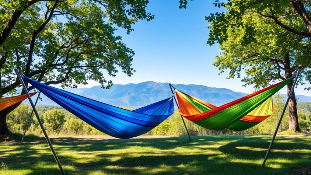 Selecting a camping hammock with a stand becomes much easier when it’s simple to set up. I look for models with tool-free assembly that I can get ready within minutes, saving time and effort. Adjustable hooks or positions on the stand are a plus, making it quick to customize without fuss. Clear, step-by-step instructions or minimal components help even beginners set it up confidently. I also prefer lightweight, portable designs like foldable frames and carry cases, which make transportation straightforward. Parts that connect easily—using knob screws or quick-lock mechanisms—are essential for hassle-free assembly. Overall, choosing a hammock with an intuitive setup process ensures I spend more time relaxing and less time wrestling with complicated instructions or tools.
