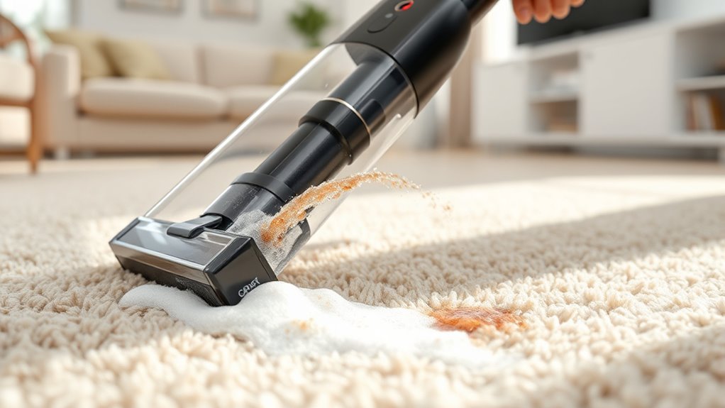 Tank capacity plays a key role in how effectively a portable carpet cleaner can handle your cleaning tasks. A larger tank means you can clean longer without stopping to refill or empty, making it ideal for bigger areas or multiple rooms. Conversely, smaller tanks are lighter and easier to maneuver, perfect for quick spot cleaning or small jobs. Many models feature dual tanks, typically between 16 oz and over 60 oz, balancing portability with usability. When choosing a cleaner, think about your typical cleaning needs—if you tackle large spaces regularly, opt for a bigger capacity. For occasional use or quick touch-ups, smaller tanks will keep the device lightweight and manageable. Matching tank size to your routine ensures efficient, uninterrupted cleaning.