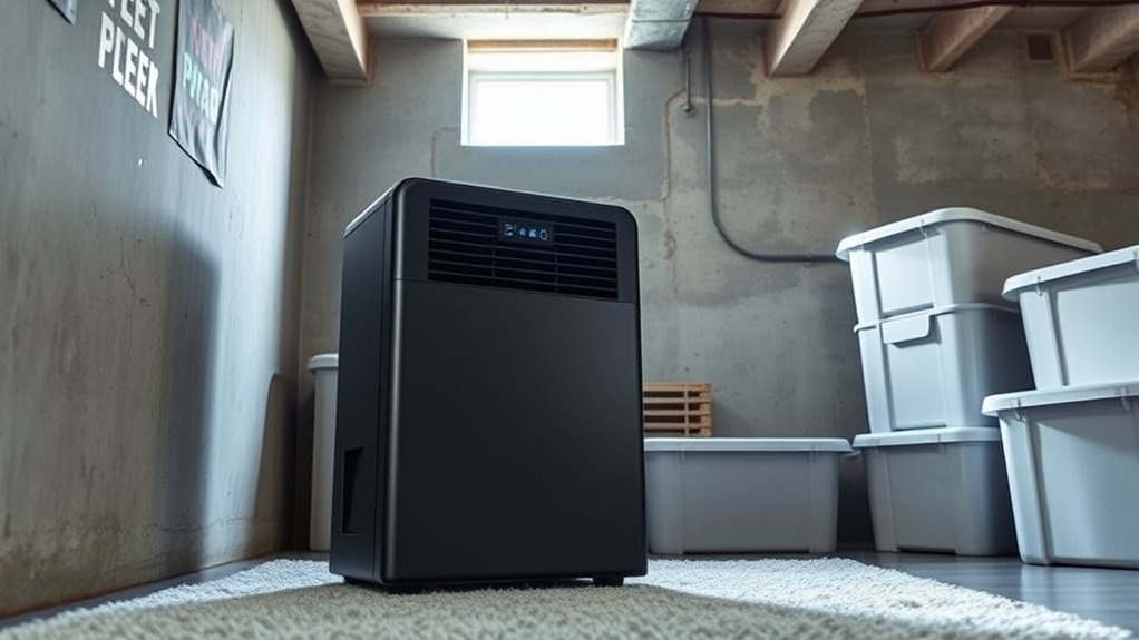 Matching your dehumidifier’s capacity to your basement size is just the start; paying attention to humidity control features makes a big difference in maintaining a comfortable and mold-free environment. Adjustable humidity levels, usually between 30% and 80%, let me fine-tune moisture levels exactly how I want them. Smart sensors are a game-changer—they automatically adjust operation to keep humidity steady, reducing manual effort. Modes like continuous, auto, or drying let me customize how moisture is removed based on my needs. Features like auto-restart and auto-defrost ensure consistent performance even after power outages or in cold temperatures. Digital displays and touch controls give me real-time feedback and easy adjustments, helping me maintain *ideal* humidity without guesswork. These features make my basement more comfortable and mold-resistant.