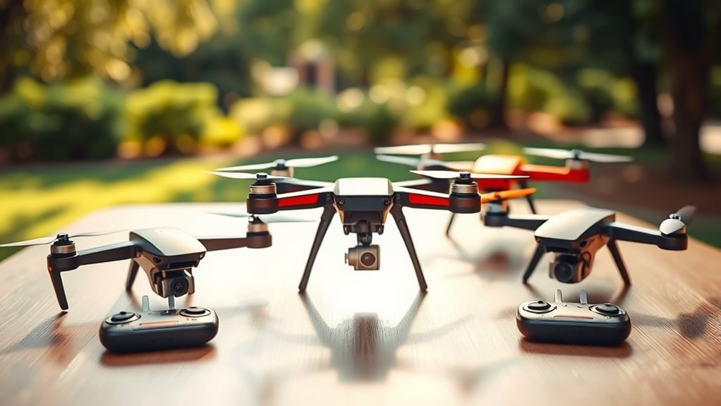 Are you getting the best value for your money when picking a beginner drone kit? It’s crucial to weigh the overall cost against the features offered. Entry-level kits typically range from $50 to $150, striking a good balance between affordability and functionality. Look for kits that include extra batteries and spare parts—they extend flying time and save you money on replacements. Higher-priced kits often have better build quality, more advanced features, and educational materials that support long-term learning. Comparing the price to what’s included helps guarantee you’re getting the most value for your skill level and enjoyment. Ultimately, choosing a kit that offers quality components and helpful resources makes your flying experience more rewarding and worthwhile.