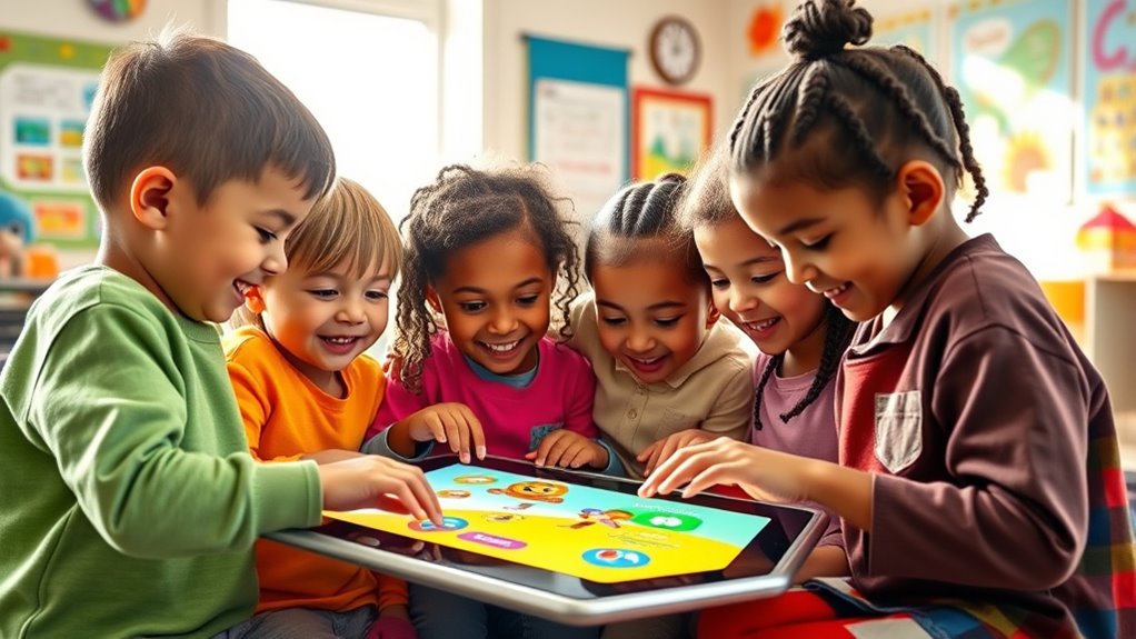 Parental control features are essential tools that help guarantee your child’s safety and appropriate use of educational tablets. They let me set screen time limits, so my child doesn’t spend too long on the device. Content filtering options are helpful too, allowing me to customize accessible apps, websites, and media based on age. Monitoring tools like activity reports and usage logs give me insight into what my child is engaging with, ensuring they’re on safe and educational content. Parental controls also let me approve or restrict downloads and in-app purchases, which keeps digital spending safe. Some tablets even offer remote management through apps, making it easier to adjust settings and oversee content from my smartphone. These features give me peace of mind while fostering responsible device use.
