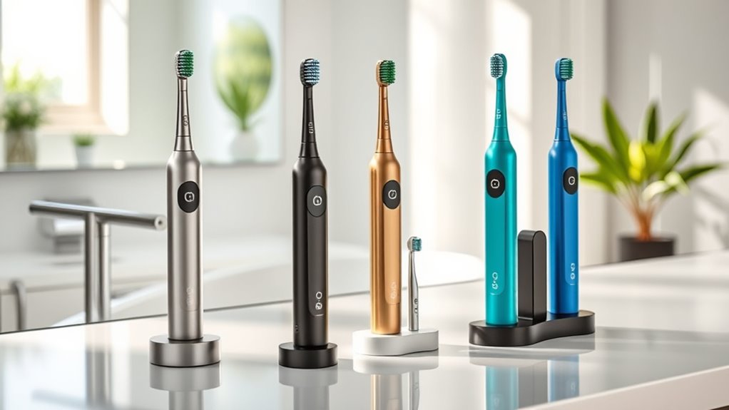 Smart technology features are transforming electric toothbrushes into more effective and personalized oral care tools. Bluetooth connectivity allows the brush to sync with smartphone apps, providing real-time feedback and personalized coaching to improve your brushing habits. Sensors detect how much pressure you’re applying, alerting you to avoid over-brushing and protect your gums and enamel. Many models include timers, quadrant alerts, and progress tracking to guarantee you brush for the dentist-recommended two minutes and cover all areas thoroughly. Some brushes utilize BrushSync or similar technology to remind you when to replace the brush head, maintaining peak cleaning. Additionally, integrated mobile apps offer detailed analytics, goal setting, and tips, making it easier to develop healthier oral care routines and achieve a brighter, healthier smile.
