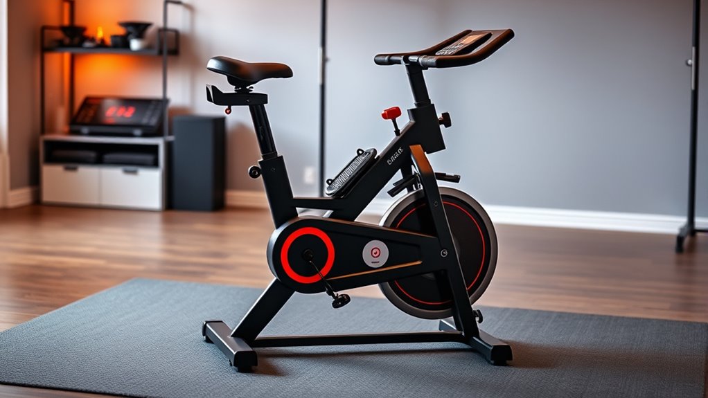 Resistance levels play a key role in customizing your workout experience on an exercise bike under $500. Most models offer between 8 to 16 levels, giving you a good range of intensity options. Magnetic resistance systems are common in budget-friendly bikes, allowing for smooth, quiet adjustments via a dial or lever. Some bikes feature manual resistance controls, where you turn a knob to set the difficulty, while others include digital controls for easier changes. The resistance level directly affects workout difficulty, with higher levels simulating hill climbs or intense training. Having multiple resistance levels makes the bike more versatile, letting you focus on endurance, strength, or recovery workouts. This flexibility is essential for progressing your fitness safely and effectively.