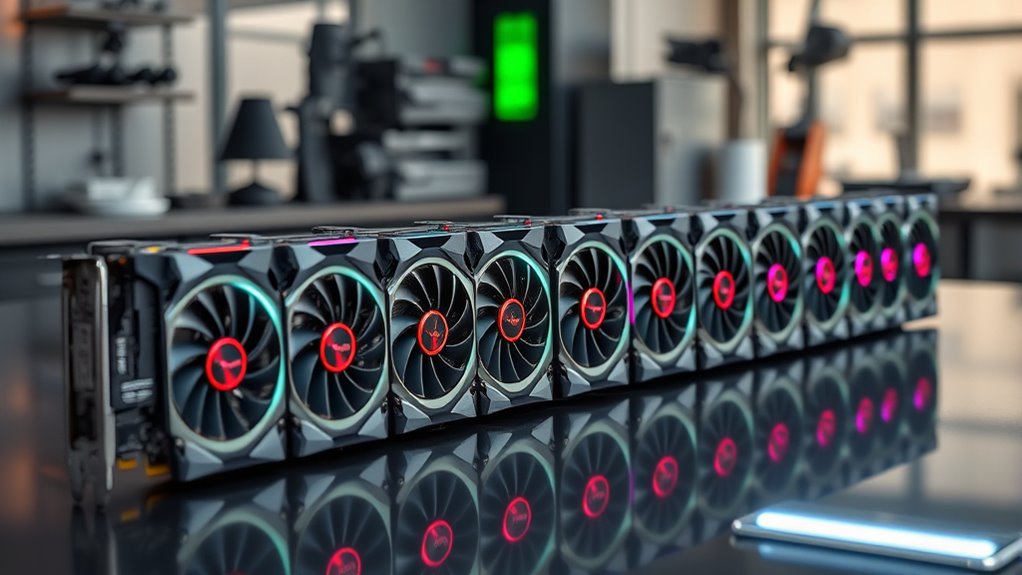 Ensuring your mid-range graphics card stays cool and quiet during gameplay is key to a smooth experience and long-term reliability. Effective cooling solutions like multiple fans and vapor chamber technology help keep GPU temperatures in check, preventing thermal throttling during long gaming sessions. Noise levels depend on fan design and RPM; quieter cards often feature larger, low-RPM fans or hybrid cooling systems that reduce noise at light loads. Maintaining temperatures below 75°C is vital for longevity and stability, especially in compact cases with limited airflow. Proper setup, including good case airflow and additional fans if needed, is essential to keep temperatures low and performance ideal. Manufacturers often optimize fan curves to strike a balance between noise and cooling, with some models offering customizable settings for quieter operation.
