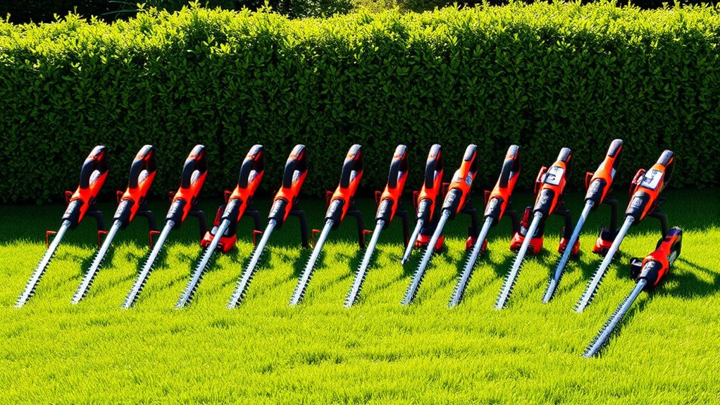 While choosing a cordless hedge trimmer, I can’t overlook the importance of weight and ergonomics. Lighter trimmers, typically under 5 pounds, considerably reduce fatigue, making it easier to tackle longer trimming sessions. I find that ergonomic handles with non-slip grips enhance control and comfort, especially when I’m working in tight spaces. Adjustable or rotatable handles are a game-changer too, as they help maintain proper posture and minimize strain on my wrists and shoulders. Plus, the overall weight distribution affects how easily I can maneuver the trimmer. Well-balanced models allow for better handling, while features like soft grip surfaces and contoured handles prevent hand fatigue and blisters during prolonged use, ensuring a more enjoyable gardening experience.