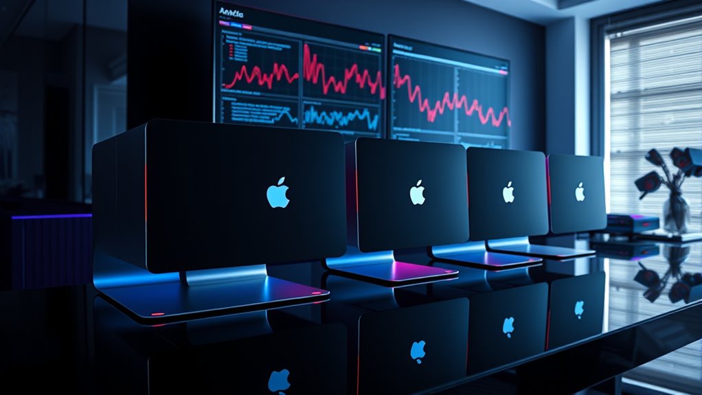 Have you ever considered how processing speed impacts the efficiency of machine learning on a Mac Studio? Higher speeds are crucial for quick model training and inference, especially with large datasets. The number of CPU cores plays a significant role, allowing the system to handle complex algorithms more swiftly. Advanced GPU capabilities, like hardware-accelerated ray tracing and multiple cores, further cut down training times for deep learning models. Faster memory bandwidth, such as 120GB/s, minimizes data transfer bottlenecks during intensive computations. Additionally, dedicated Neural Engines work alongside CPUs and GPUs to accelerate machine learning workloads. All these factors combined ensure that your Mac Studio operates at peak efficiency, reducing training time and enhancing overall productivity in machine learning tasks.