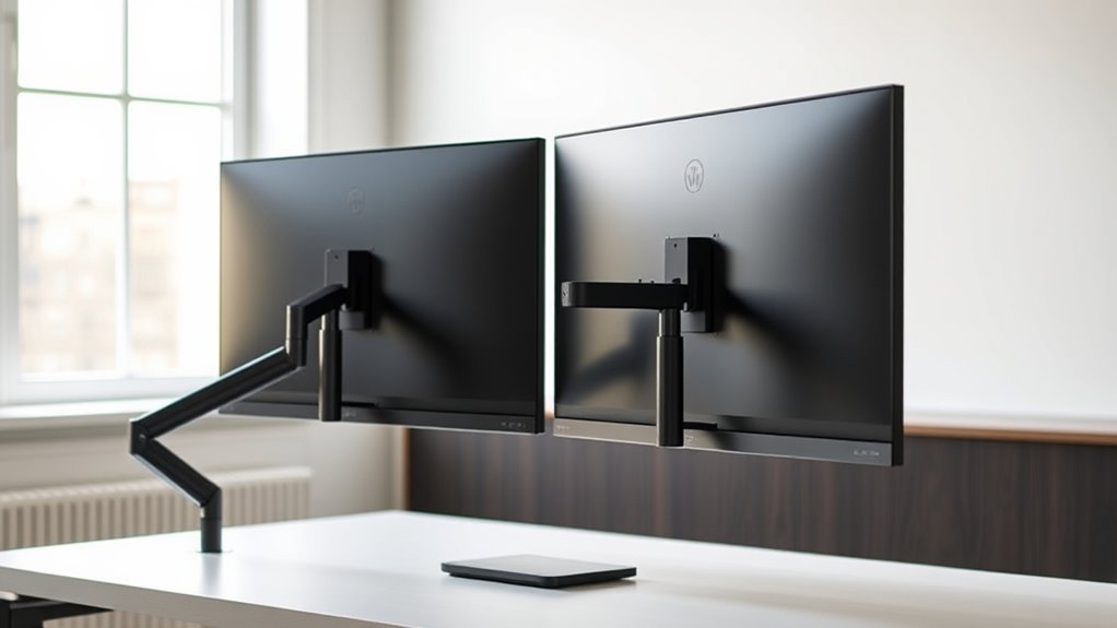 Are your monitors compatible with the monitor arms you’re considering? First, check that your monitors fall within the supported size range, typically 13-32 inches or up to 40 inches for larger models. Next, confirm the weight doesn’t exceed the arm’s maximum load capacity, usually between 4.4 and 26.4 pounds per arm. Most modern monitors have standard VESA mounting holes, like 75x75mm or 100x100mm, so verify this to ensure compatibility. If your monitor isn’t VESA-compatible, you might need adapters or specialized mounts. Additionally, consider features like curved screens or ultrawide formats, making sure the arm can handle their dimensions and weight without sagging or instability. Proper compatibility guarantees a secure, functional dual monitor setup.