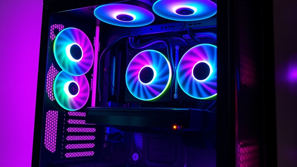 Think of fan placement like guiding a river’s flow, directing cool air where it’s needed most. Properly positioned fans create a breeze that sweeps heat away from hot spots, improving cooling performance. I always make certain intake fans at the front bring in fresh air, while exhaust fans at the back and top push hot air out. This strategic placement keeps my components cool and my system quiet.