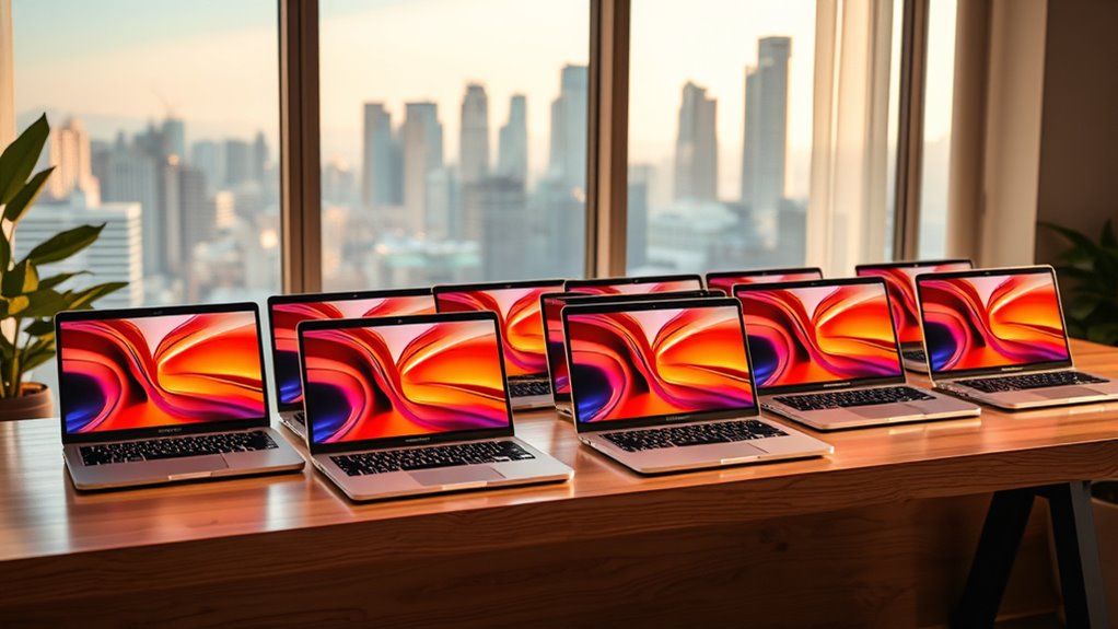 When choosing a silent fanless MacBook for travel, the display quality plays a essential role in guaranteeing a vibrant and comfortable viewing experience. A high-quality screen should feature a Retina or Liquid Retina display with true color accuracy and support for wide color gamuts like P3, delivering vivid visuals. Brightness levels of at least 500 nits are critical for clear visibility outdoors and in bright environments. Resolution standards, such as 2560×1664 pixels for 13-inch models and 2880×1864 pixels for 15-inch models, ensure sharp, detailed images suitable for multimedia tasks. Support for True Tone technology helps maintain consistent color temperature, reducing eye strain during extended use. Additionally, displays with high contrast ratios and broad color support create an immersive viewing experience, even in lightweight, portable models.