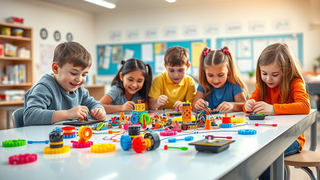 To support a child’s skill development at age 8, it’s important to select STEM toys that challenge their critical thinking and problem-solving abilities through gradually more complex activities. These toys should include hands-on tasks that teach core engineering and scientific principles, like circuitry, mechanics, or renewable energy. I believe skill development is most effective when children can experiment, iterate, and explore without relying solely on digital interfaces, fostering real-world understanding. Toys that incorporate practical scenarios help kids see how STEM concepts apply in everyday life, making learning meaningful. The complexity of tasks should match their developmental level, ensuring they feel confident and stay engaged. Carefully chosen STEM toys at this age promote not just learning but also a lasting interest in STEM fields.